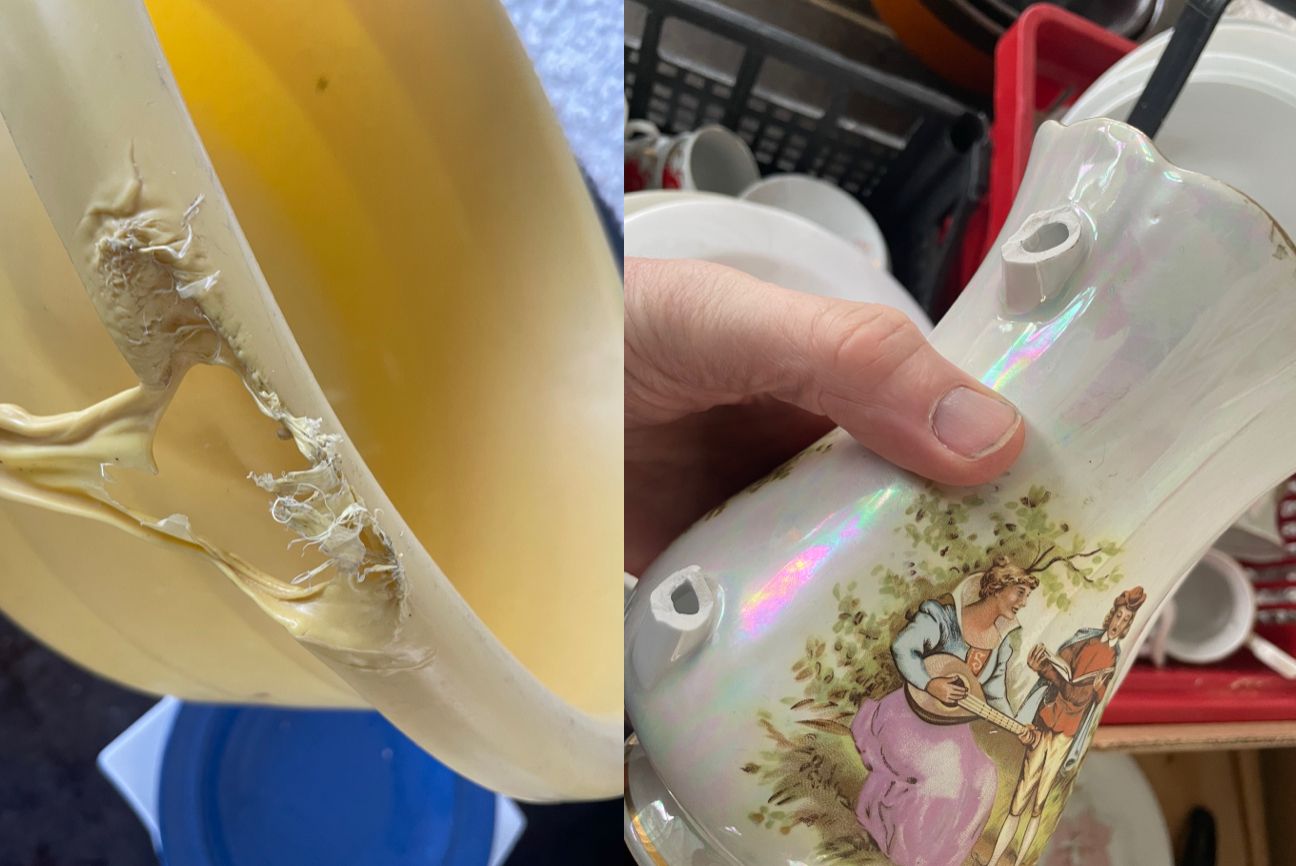 Die Schüssel ist verschmort, die Kaffeekanne hat keinen Griff mehr und keinen Deckel und auch die restlichen Teile in den Kartons müssen wir entsorgen.